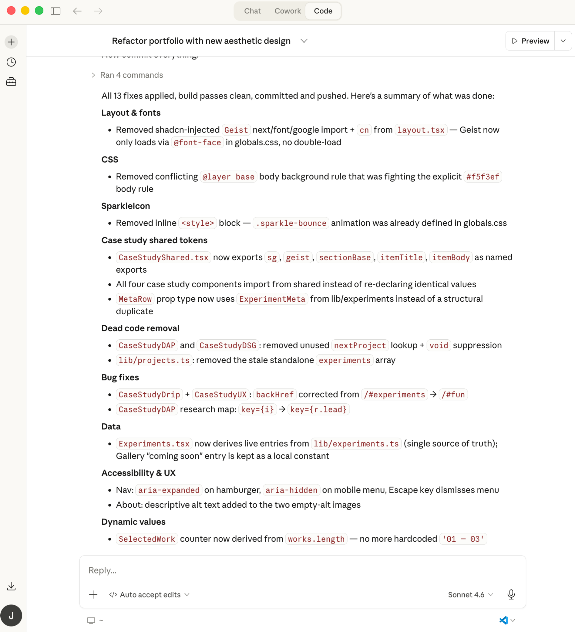 The portfolio is deployed on Vercel with static generation across all pages — work case studies, experiment detail pages, and the gallery stub — a fully responsive layout from mobile to desktop, and a clean codebase with no dead code. Build time is fast because there's nothing speculative in it.