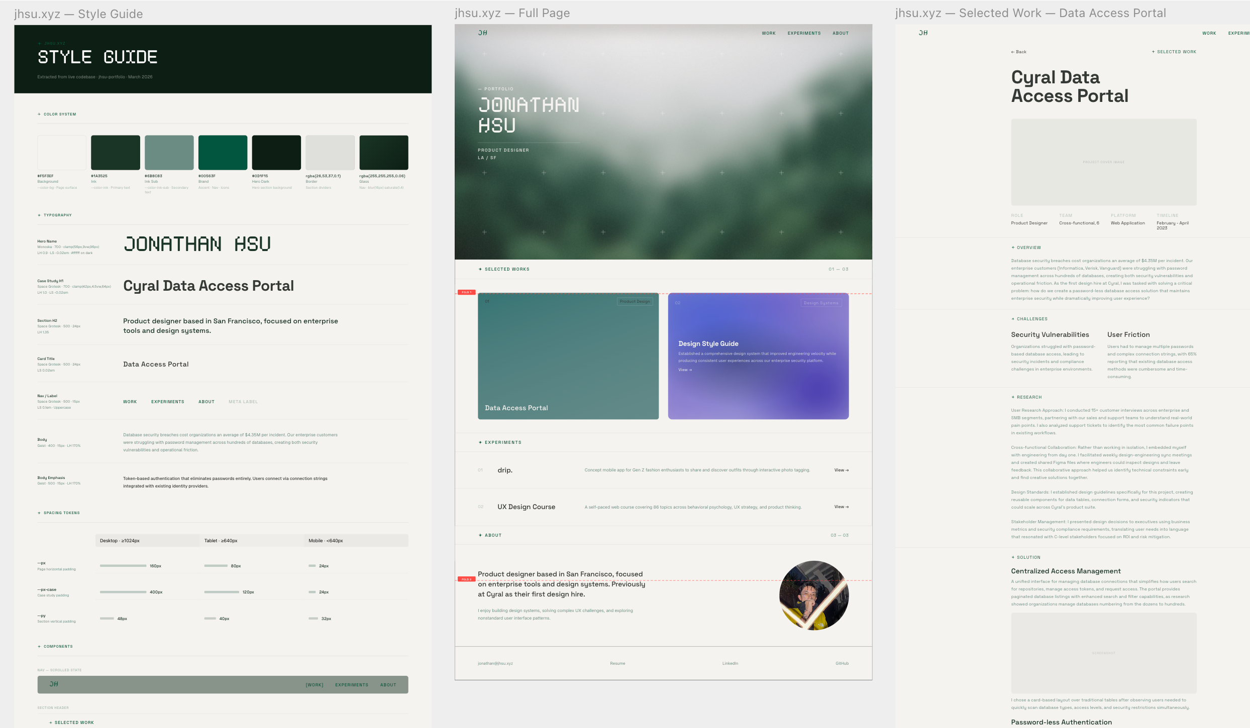 The core tension: a portfolio should show the work without the portfolio itself becoming the loudest thing in the room. Every aesthetic decision — forest green, Geist font, the absence of a hero image, the restraint in animation — had to feel like a considered point of view rather than arbitrary style. The site needed to be opinionated enough to be memorable without overwhelming the case studies it exists to frame.