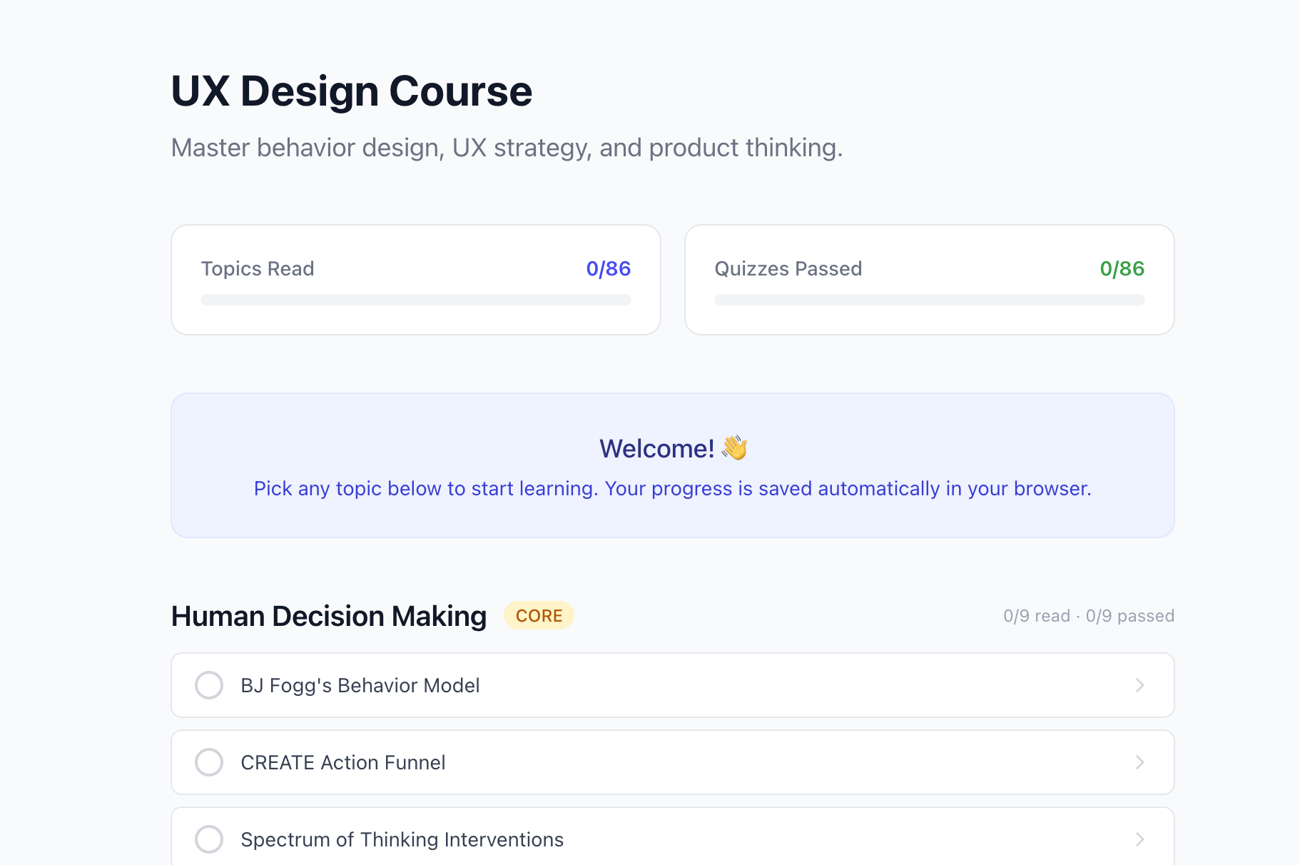 The course is deployed at ux-design-course.vercel.app with 86 topics across 7 modules, full quiz mechanics, and progress persistence. It functions as a reference I return to when I need to ground a design decision in a behavioral principle — and a template for what AI-assisted course authoring can look like at speed.