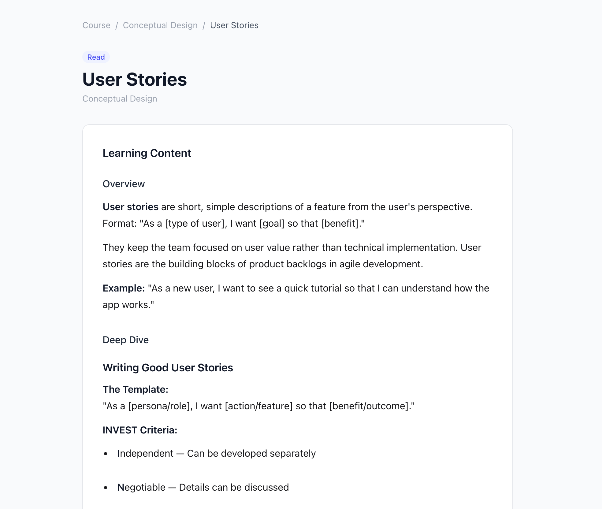 A course that's just articles is a blog. Each topic needed a mechanism to test comprehension and create a moment of active recall. I used Claude to generate quiz questions for each topic — not generic multiple choice, but questions targeted at the specific misconceptions a designer is likely to carry into that concept. Four questions per topic keeps the bar meaningful without being punishing.