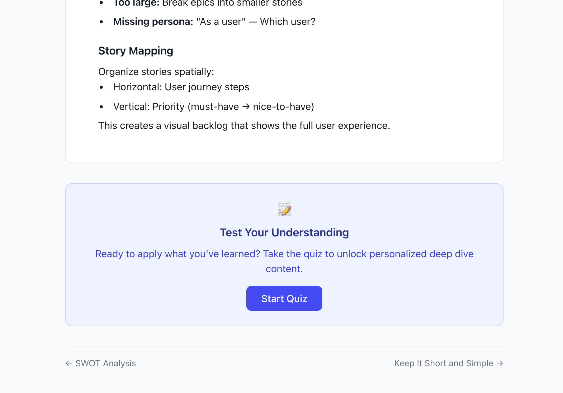 The content model is a flat array of topic objects — adding a new topic is a one-line addition. The quiz questions are co-located with the topic data, not in a separate CMS, which keeps authoring fast. This architecture was designed with the AI personalization direction in mind: the data shape is already compatible with a model reading and responding to it dynamically.